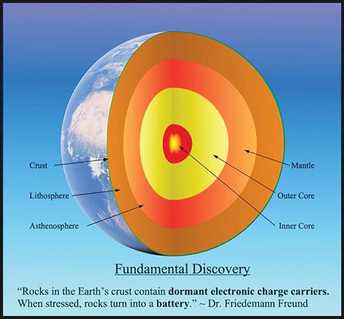 • In 2006, Dr. Friedemann Freund, a NASA physicist, completed his laboratory experiment confirming his theory that earthquake lights were the result of electron flow propagating through the lithosphere when peroxy defects in their minerals were subjected to stress. His conclusion was that under certain conditions, igneous rock beneath our feet turns into a giant battery.