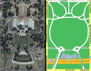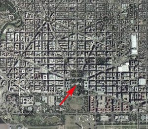 The first series of symbols I will point out deal with the seat of the executive branch of government, the White House, indicated by the red arrow above. If you are a Google Earth user, you can see these satellite images for yourself at Google Maps.