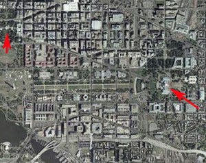 In this photograph, I’ve indicated both the White House (left) and the Capitol building (right).