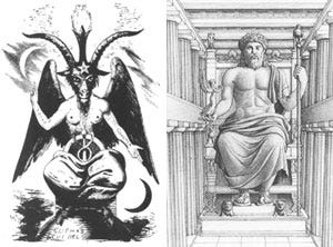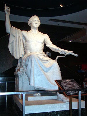 This statue of Washington in the Smithsonian Museum of American History was modeled after descriptions of the statue of Zeus at Olympia, one of the 7 wonders of the ancient world. The museum is aligned to the cardinal directions, the statue sits at the western end of the main floor facing east. Compare this portrayal of Washington to the images of Zeus and Baphomet - do you notice any similarities?