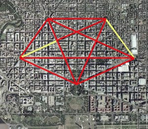 As you can see by my outline, the White House sits at the apex of an inverted pentagram. This symbol is incomplete by only 2 small pieces, indicated by the yellow lines.