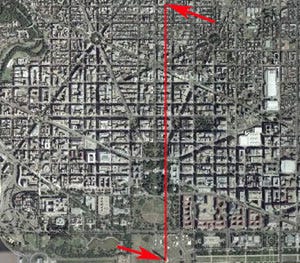 It has been said the Washington Monument obelisk (bottom arrow) sits due south from the White House. This is not exactly true, as you can see in the photo above. In reality, the obelisk is directly south from the Masonic Temple (top arrow) which sits 13 blocks north of the White House.