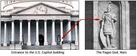 Guarding the entrance to the Capitol building is Nimrod (Baal) in the likeness of the Roman god Mars, whom the Egyptians called Osiris. As you can see from the image below this entrance is identical to that of the Roman Panthenon of the Gods - as well as the Greek Parthenon.