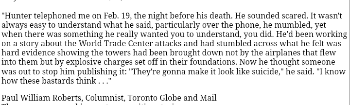 The night before he died, Hunter S. Thompson (who claimed that he attended George Bush's "Hillbilly" camp at Bohemian Grove) called journalist Paul William Roberts to tell him that he had proof 9/11 was a controlled explosion. Hunter said, "They're gonna make it look like suicide. I know how these bastards think."