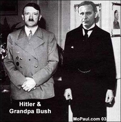 George H.W. Bush's father Prescott Bush (seen here with Hitler) was a director of the Union Banking Corporation (UBC) that held Nazi financier Fritz Thyssen's assets, which led to Bush's bank getting its assets seized in 1942 for violating the Trading with the Enemy Act.