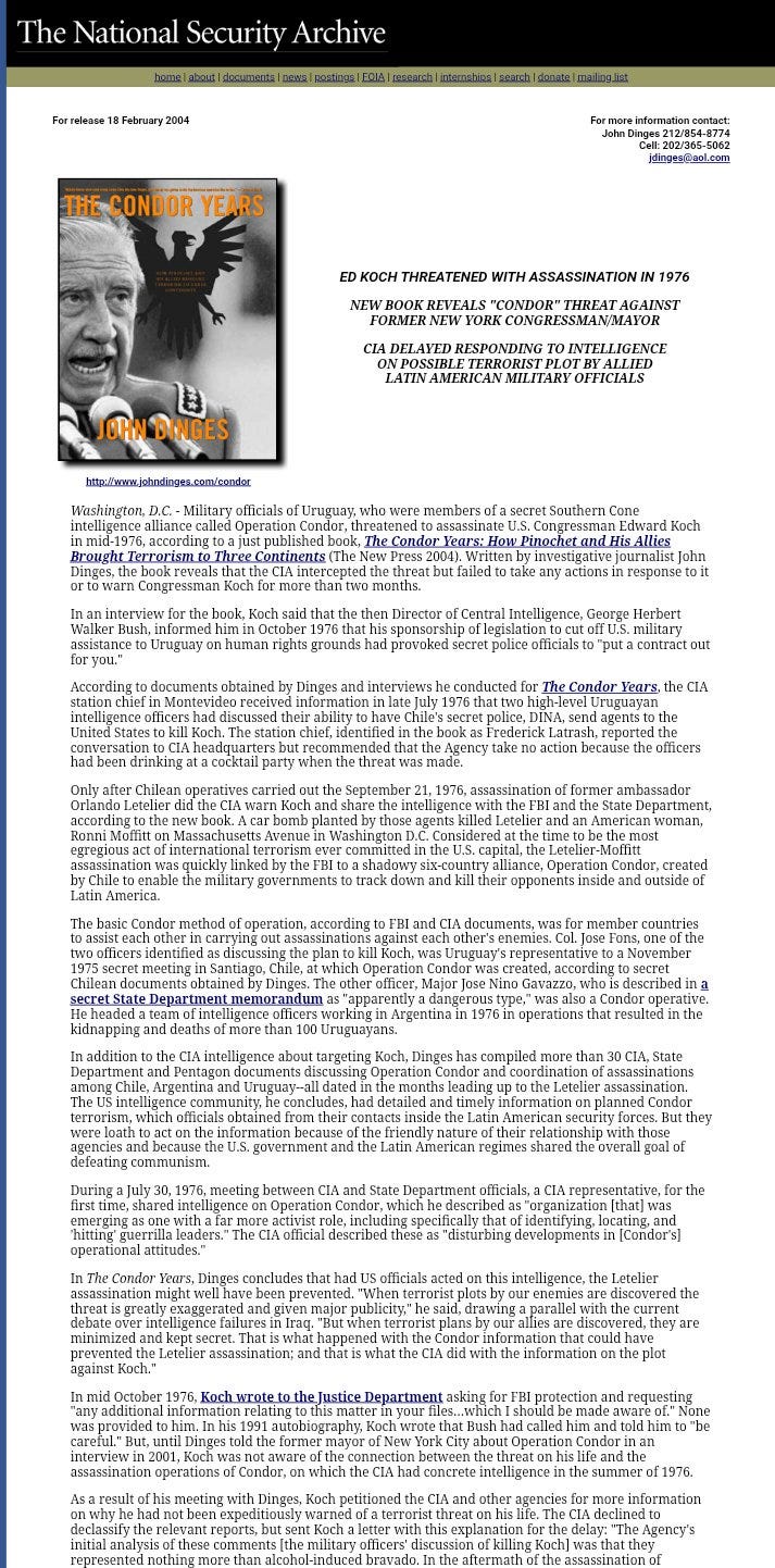 In October 1976, the month after the car bombing in D.C., George Bush told then-congressman Ed Koch that Operation Condor put out a contract on Koch's life for trying to cut funding to Uruguay. Bush's CIA knew about the assassination plot months earlier but did not tell Koch.