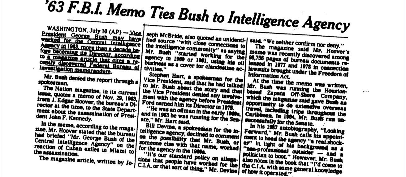 Little more than an hour after JFK was shot, George Bush called the FBI to register a tip that he heard "James Parrot," a possible college student, was plotting to kill JFK, according to a stunning FBI memo made public in the 1980's. Bush then flew to Dallas.