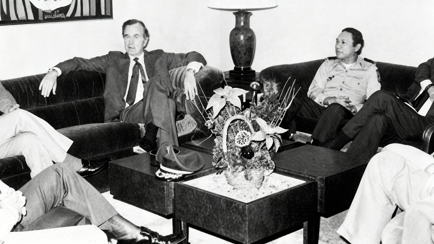 In 1976, George Bush first met Manuel Noriega, a longtime CIA asset. Bush was photographed with Noriega in 1983, the same year Noriega was installed as dictator of Panama. Together, Bush and Noriega oversaw a drug-trafficking empire that ended when Noriega defied CIA policy and backed the Sandinistas, leading Bush to invade Panama in 1989 in one of the numerous controlled wars that Bush helped engineer.