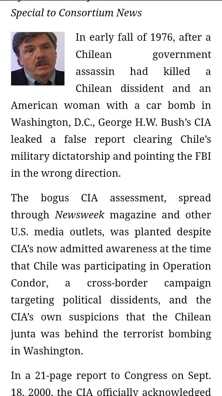 As CIA director, George Bush oversaw "Operation Condor," in which CIA-friendly Latin American dictators killed their opponents. When Chilean dictator Augusto Pinochet ordered a deadly car-bombing in Washington, D.C., Bush leaked Fake News to dupe the FBI and cover for Pinochet