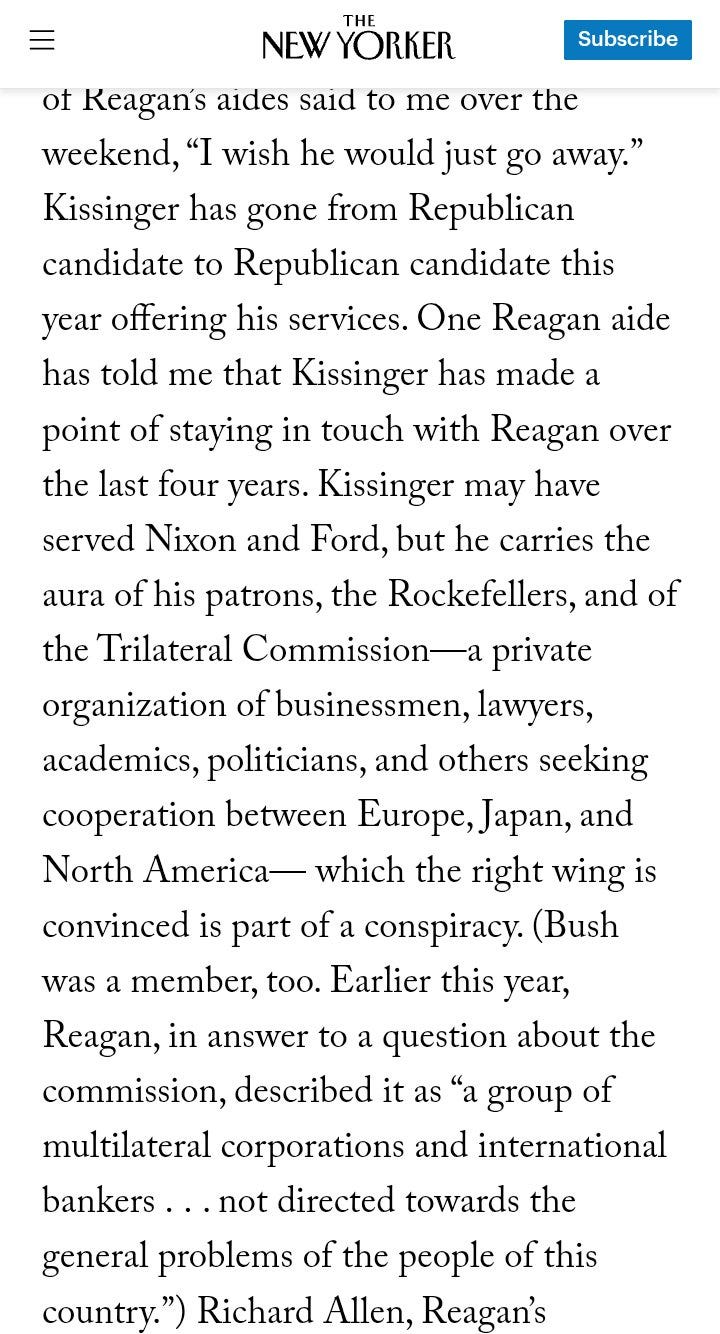 In 1980, George Bush lost a bitter primary to Ronald Reagan. On the trail, Reagan called the Trilateral Commission “a group of multilateral corporations and international bankers...not directed towards the general problems of the people of this country.”