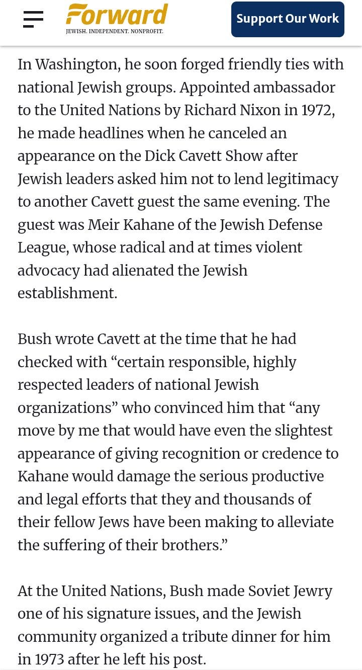 In 1971, George Bush became Nixon's UN ambassador and spearheaded the Zionist cause of letting Soviet Jews emigrate. He cancelled a Dick Cavett appearance at the behest of "Jewish leaders" and had a 1973 NYC dinner thrown in his honor by the "Let My People Go" movement. Later, as president, he got rid of the UN resolution that Zionism is racism.