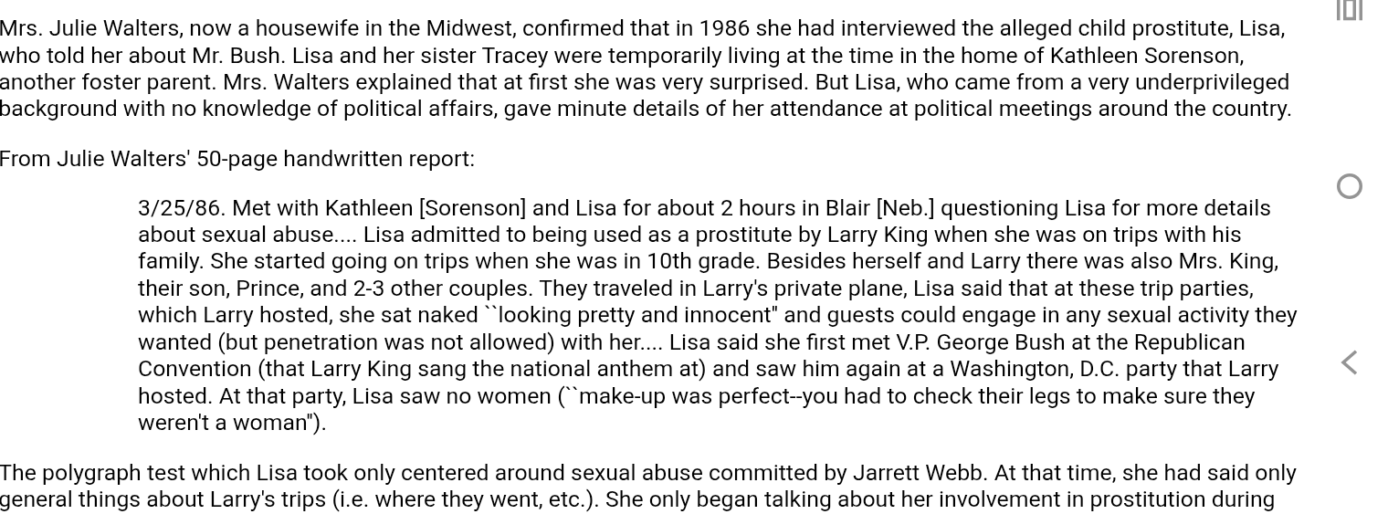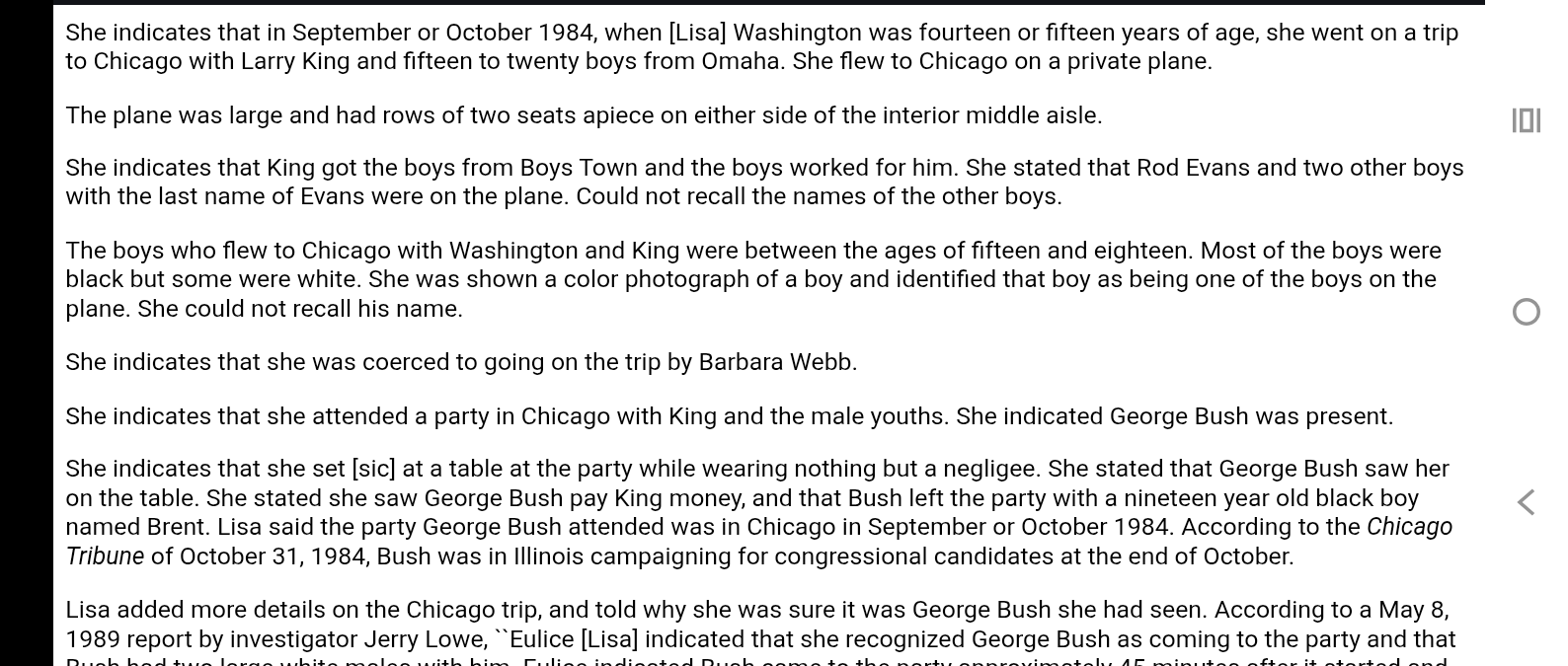 A foster child named Eulice “Lisa” Washington came forward to Nebraska social worker Julie Walters and also the FBI. Lisa explained that she saw George H.W. Bush at a gay sex party in D.C. and another in Chicago where he left with a 19-year old black male named Brent.