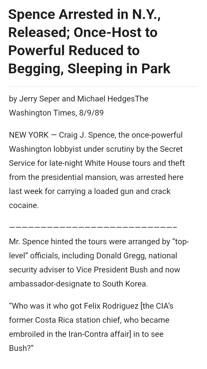 In August 1989, shortly before he died, pedo-ring member Craig Spence consented to an interview with the Washington Times in which he fingered George H.W. Bush adviser Donald Gregg (longtime CIA spook) as the facilitator of the call-boy tours of the White House