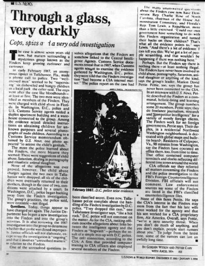 In 1993, after Bush left the White House, DOJ opened a probe based on info that the Finders were a CIA front. According to US News and World Report, the CIA admitted “A firm that provided computer training to CIA officers also employed several members of the Finders.”