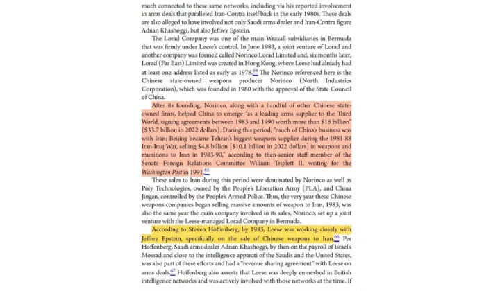 In the 1980’s, Jeffrey Epstein worked with British arms dealer Douglas Leese to funnel Chinese weapons to Iran, according to @_whitneywebb‘s book “One Nation Under Blackmail.” This operation ran parallel to George Bush’s Iran-Contra scheme...