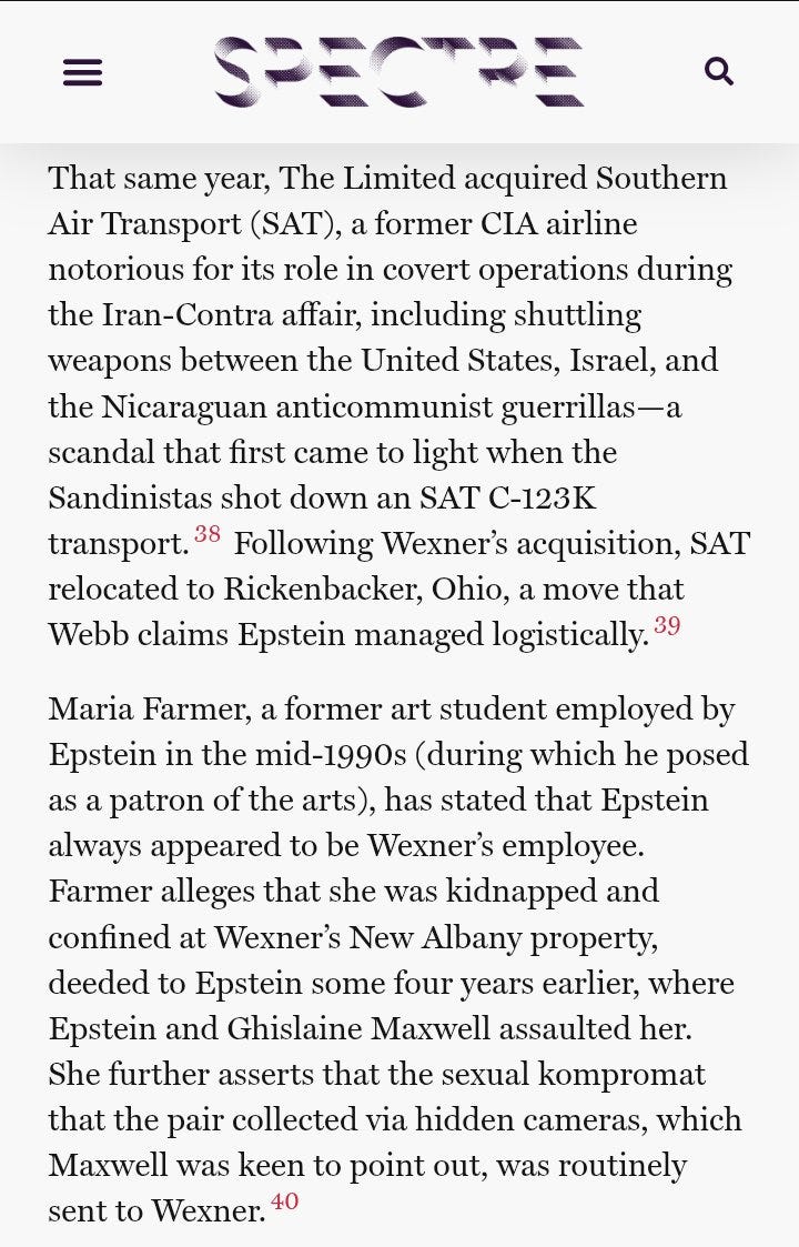 The CIA's infamous "Air America" airline used to carry out the Iran-Contra scheme was purchased by Les Wexner and converted into a private airline by none other than Jeffrey Epstein, who claimed to be a CIA asset during Reagan-Bush according to Epstein crony Steven Hoffenberg