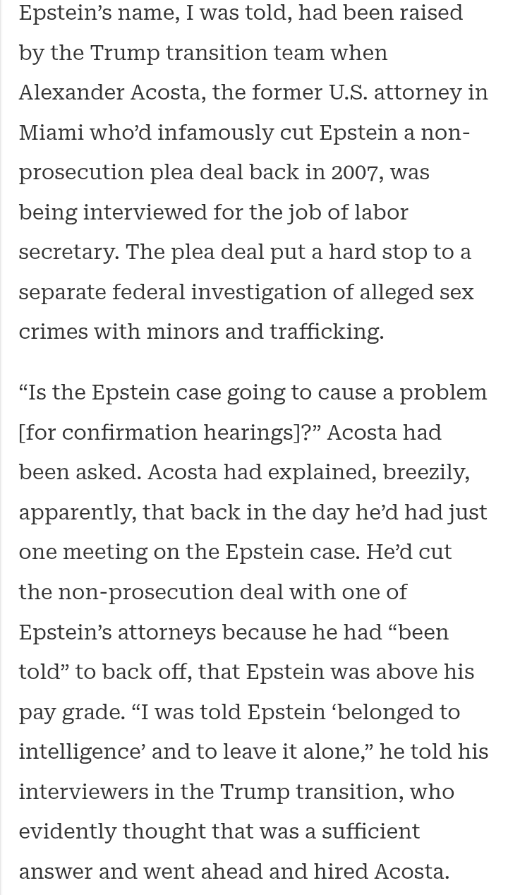 When Jeffrey Epstein got arrested for pedophilia the first time he visited Israel and then got a sweetheart plea deal from the Bush administration's Alex Acosta, who was told Epstein "belonged to intelligence" according to Vicky Ward.