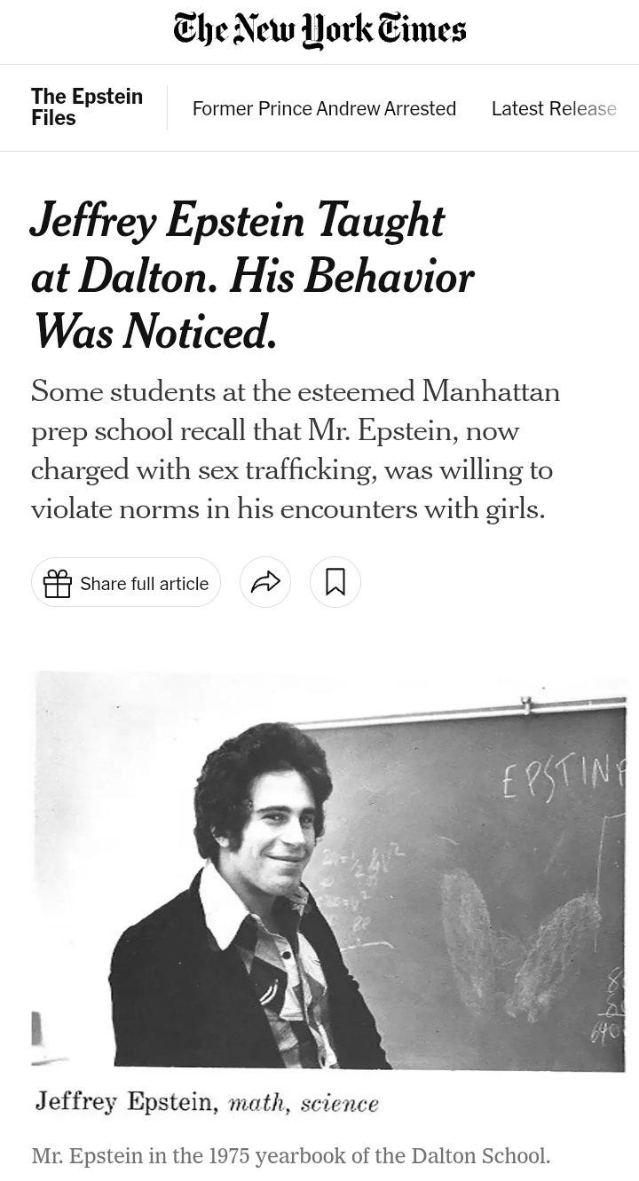 College dropout Jeffrey Epstein started teaching at the elite Dalton School immediately after the 1974 departure of headmaster Donald Barr, father of William Barr and author of “Space Relations,” a 1973 sci-fi novel about sex slavery.
