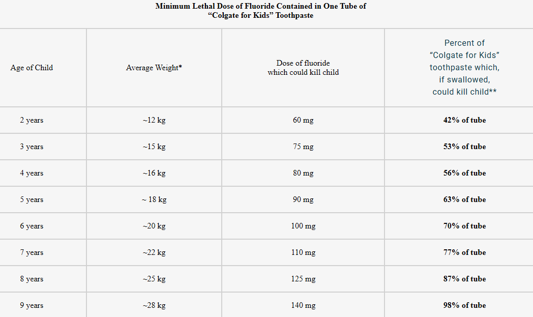 “Fluoride is a poison!” Yiamouyiannis warns.” The 1984 issue of Clinical Toxicology of Commercial Products lists fluoride as more poisonous than lead and just slightly less poisonous than arsenic. It has been used as a pesticide for mice, rats and other small pests. A 10-pound infant could be killed by 1/100 of an ounce and a 100-pound adult could be killed by 1/10 of an ounce of fluoride. The Akron Regional Poison Center indicates that a 7-ounce tube of toothpaste contains 199 mg. of fluoride, more than enough to kill a 25-pound child.”