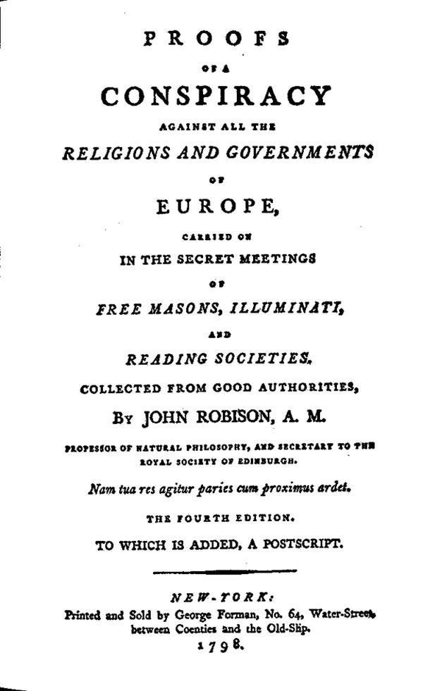 1798: John Robison publishes a book entitled, “Proofs of a Conspiracy Against All the Religions and Governments of Europe Carried on in the Secret Meetings of Freemasons, Illuminati and Reading Societies.” In this book, Professor Robison of the University of Edinburgh, one of the leading intellects of his time, who in 1783 was elected general secretary of the Royal Society of Edinburgh, gave details of the whole Rothschild Illuminati plot.