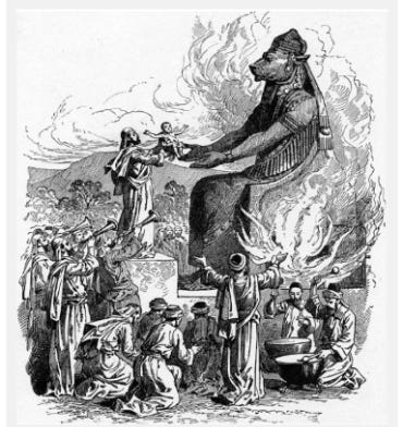 “Some people say that Baal and Moloch were actually the same god, just with different names and faces. They say that the word “Molech” means “king”, and that Baal was also called “king”. They say that some of the stories and rituals of Baal and Moloch were similar, and that they were both worshiped in the same places and times. They say that Baal and Moloch were both aspects of the same divine power, and represented the two sides of the same coin.” ~ from “The Good, the Bad, and the Ugly: Baal and Moloch as Contrasting Figures in Canaanite Religion” by Zacharias Hendrik
