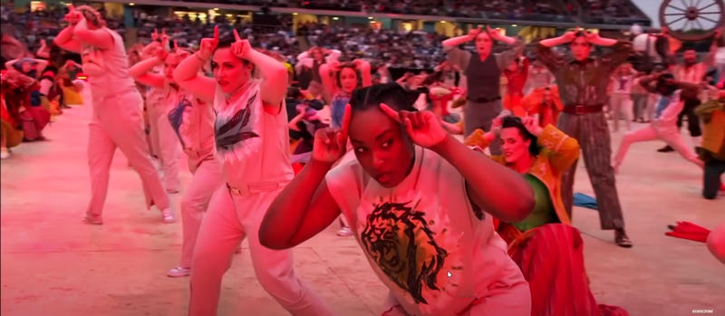 The mood suddenly changed when the lights turned red and the dancers moved in unison, raising their hands to their heads—a stark visual break from celebration that felt deliberate, unsettling, and meant to signal a darker turn in the spectacle.