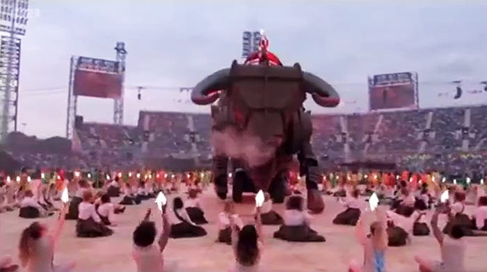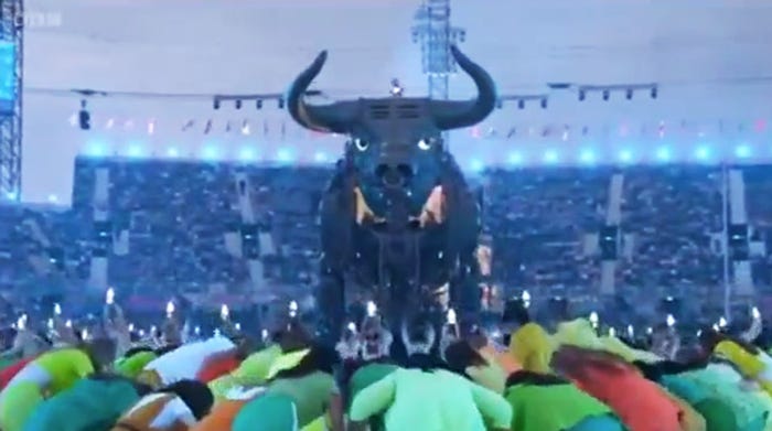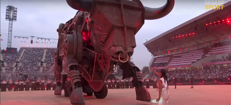 Then, a woman holding a shard of light (a recurring symbol throughout the ceremony) “tames” the bull.