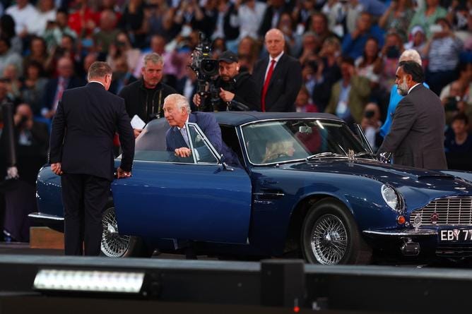 The opening ceremony of the Commonwealth games began rather … normally. Some vintage cars owned by local residents were driven into the stadium to form the shape of the Union Jack – a tribute to Birmingham’s role in automotive history. This portion of the show culminated with Prince Charles driving his own Aston Martin into the stadium.