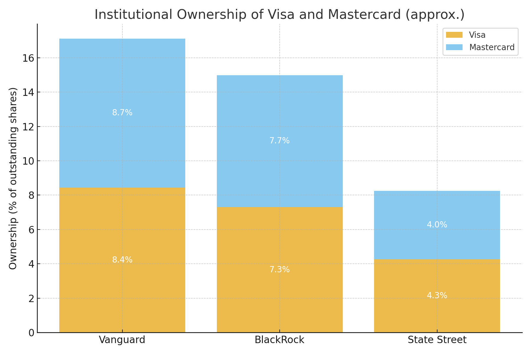 Currently, Vanguard, BlackRock, and State Street are the top three shareholders of both Visa and Mastercard.