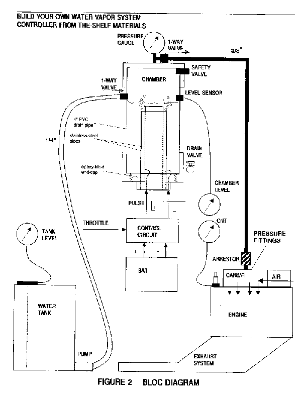 This ‘minisystem’ runs easily from your existing battery and electrical system, and it plugs into your carburetor with simple off-the-shelf fittings. You will be installing a plastic water tank, a control circuit, a reaction chamber, a hi-pressure carb/FI fitting, and 3 gauges (see Figure 1), and then hooking into your existing carb/FI.